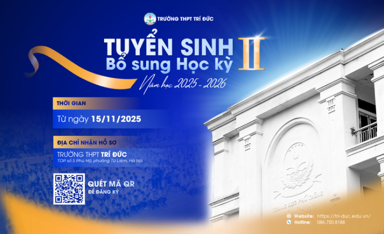 TRƯỜNG THPT TRÍ ĐỨC THÔNG BÁO TUYỂN SINH BỔ SUNG HỌC KỲ II: NĂM HỌC 2025 – 2026 1. Chỉ tiêu tuyển sinh – Lớp 10: 20 HS. – Lớp 11: 10 HS. 2. Đối tượng tuyển sinh – Học sinh đang học lớp 10, 11 đúng độ tuổi ở các trường THPT trên toàn Quốc. 3. Điều kiện tuyển
