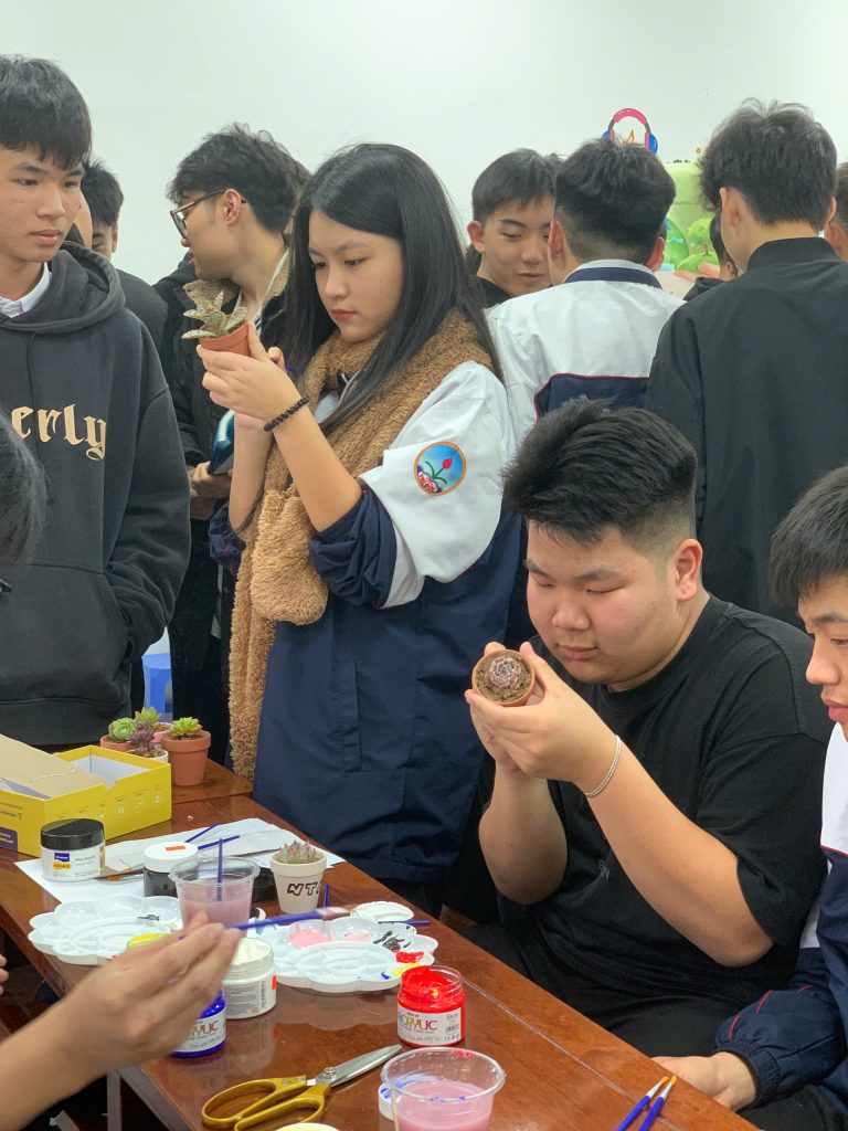 Điều mình thích nhất là sự kiện không dừng lại ở việc “đổi – nhận”. Sau khi nhận cây, các bạn còn được tham gia buổi hướng dẫn chăm sóc sen đá, hiểu rõ hơn cách giữ cho mầm xanh ấy sống lâu và phát triển tốt. Cùng với đó, workshop vẽ và trang trí chậu cây đã biến mỗi chậu sen đá thành một “phiên bản độc quyền”, mang đậm dấu ấn cá nhân của người sở hữu chậu cây. Chính mình cũng đã tự tay tạo ra một chậu sen đá “mộc bản”, vừa lan tỏa thông điệp sống xanh vừa thể hiện nét cá tính sáng tạo của học sinh Trí Đức.